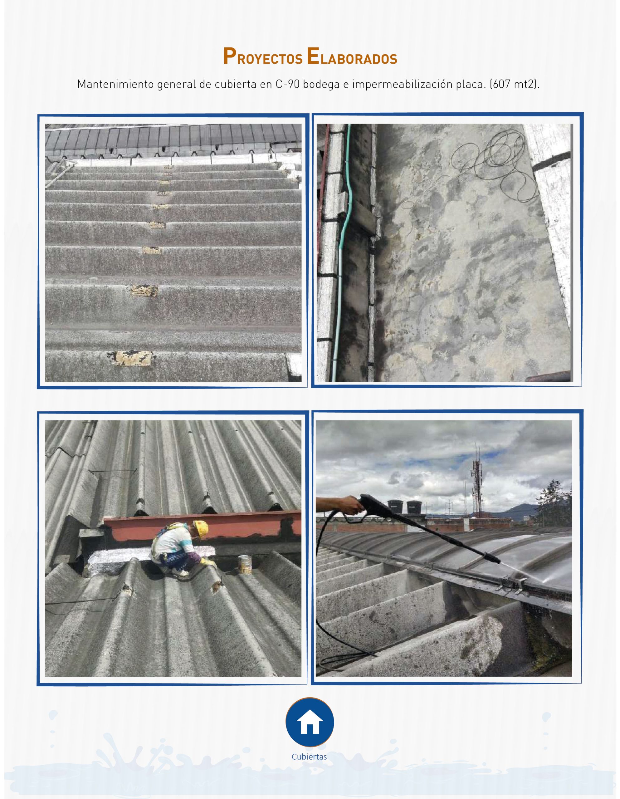 Diseño, suministro, instalación, mantenimiento, reparación e impermeabilización de cubiertas, techos, canales, placas de concreto, bajantes y viga canales.